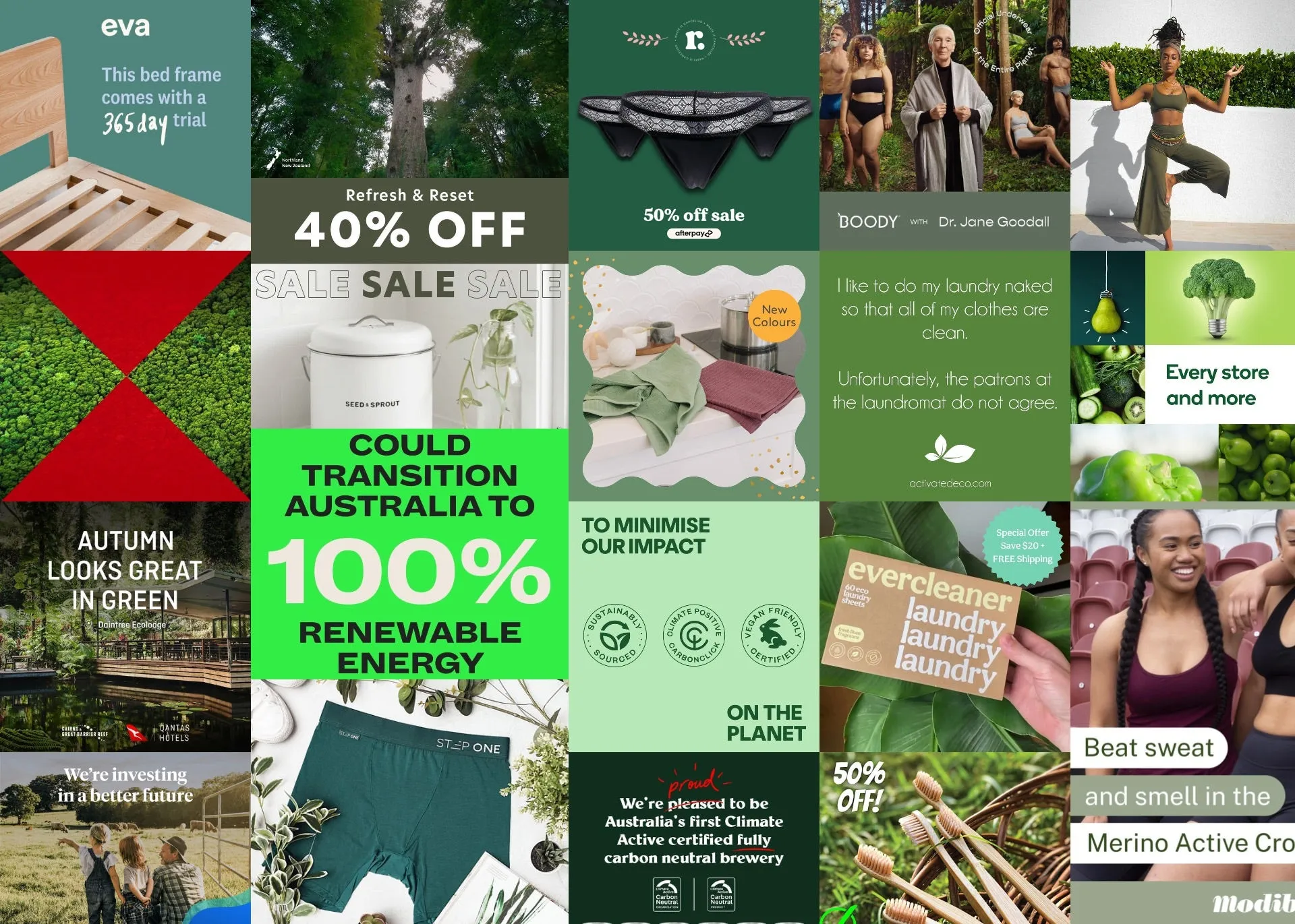 Many ads used colours and symbols to put a green “halo” around their products and business. These included green, blue and earthy beige tones, background nature imagery and emojis featuring leaves, planet Earth, the recycling symbol and the green tick, often with no context or specific information.