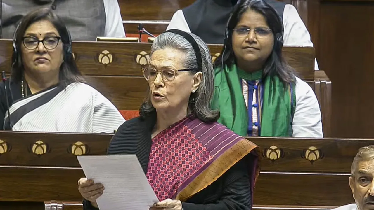 Congress leader Sonia Gandhi speaks in the Rajya Sabha during the Budget session of Parliament, in New Delhi, Monday, Feb. 10, 2025.